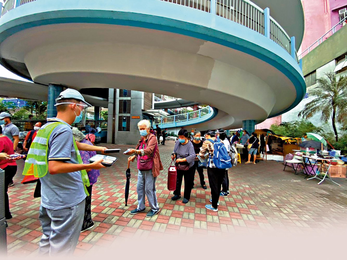派飯前半個鐘,記者見到長長的列隊,從天橋底沿樓梯「攀」上天橋,一直延伸到馬路對面的橋下。來領飯的人,大約八成為白髮長者,不少人坐在自備小櫈上等候。年屆71歲的王婆婆說,她那位年過八十歲的丈夫卧病不起,只能自己一人前來領飯,一盒飯,兩人分食。她告訴記者,附近老人家都是在口耳互傳下,得知此處「有飯攞」,愈來愈多人知,就愈來愈多人來攞,排隊時經常發生小爭執,「不過囡哥喺度就冇嘞!」