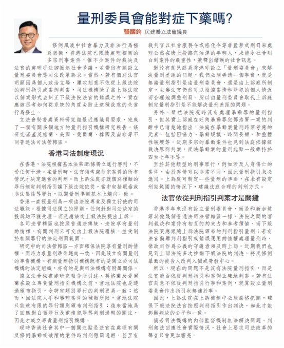 香港多年來沒有設立量刑委員會,而是和新加坡等其他幾個普通法司法管轄區一樣,法院之間的審判裁決和案件有相互的約束力和參考價值,而下級法院更應跟隨上訴法院頒布的判刑指引量刑;若有法官偏離判刑指引或錯誤運用酌情權處理量刑時,律政司作為公義的守護者須及時上訴。近期我們也見到上訴法院多次推翻下級法院的判決,將反修例暴動的被告人改判入獄或勞教中心。