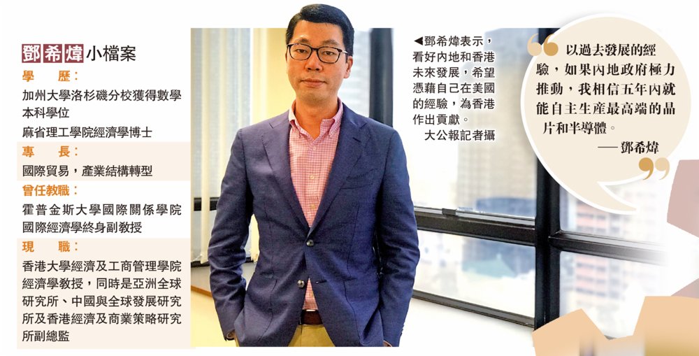 在美國發展了21年的港人鄧希煒於中美貿易戰翌年決定回到本港工作,擔任香港大學經濟學教授。鄧希煒接受大公報專訪時表示:「在此時回來,看好內地和香港未來發展,也希望憑藉自己在美國的經驗,為香港作出貢獻。」說到美國對中國實施多項制裁,包括限制高科技出口中國,他認為這反而促進中國高端科技研發。