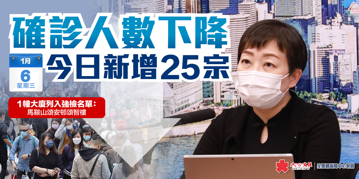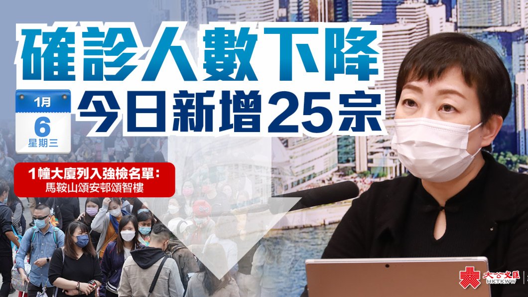 大公文匯全媒體報道,香港新冠肺炎第四波疫情持續,但近日確診數字有所回落。衞生防護中心傳染病處主任張竹君今日(6日)下午在疫情記者會上表示,截至今日凌晨零時,本港新增25宗確診個案,包括3宗輸入個案和22宗本地感染。個案涉及17男8女,年齡介乎27歲至96歲,當中8宗個案由臨時檢測中心找出。