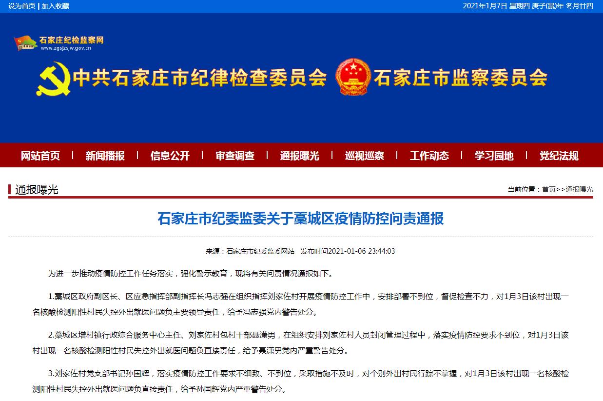 藁城區政府副區長、區應急指揮部副指揮長馮志強在組織指揮劉家佐村開展疫情防控工作中,安排部署不到位,督促檢查不力,對1月3日該村出現一名核酸檢測陽性村民失控外出就醫問題負主要領導責任,給予馮志強黨內警告處分。
