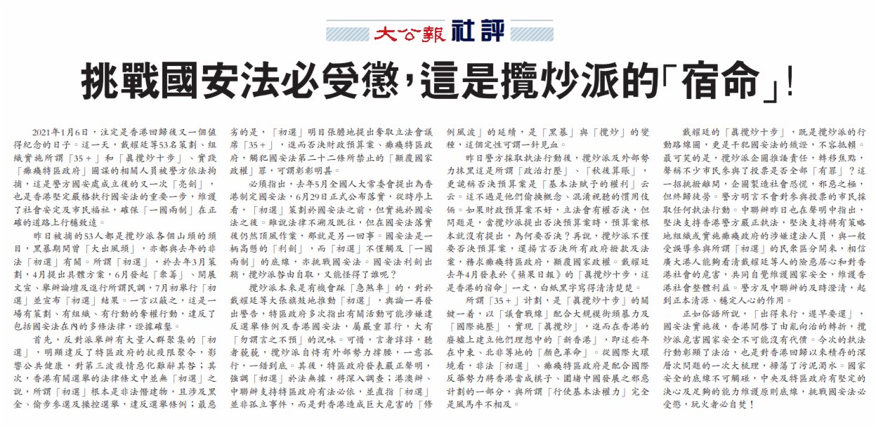 昨日被捕的53人都是攬炒派各個山頭的頭目,黑暴期間曾「大出風頭」,亦都與去年的非法「初選」有關。所謂「初選」,於去年3月策劃,4月提出具體方案,6月發起「眾籌」、開展文宣、舉辦論壇及進行所謂民調,7月初舉行「初選」並宣布「初選」結果。一言以蔽之,這是一場有策劃、有組織、有行動的奪權行動,違反了包括國安法在內的多條法律,證據確鑿。