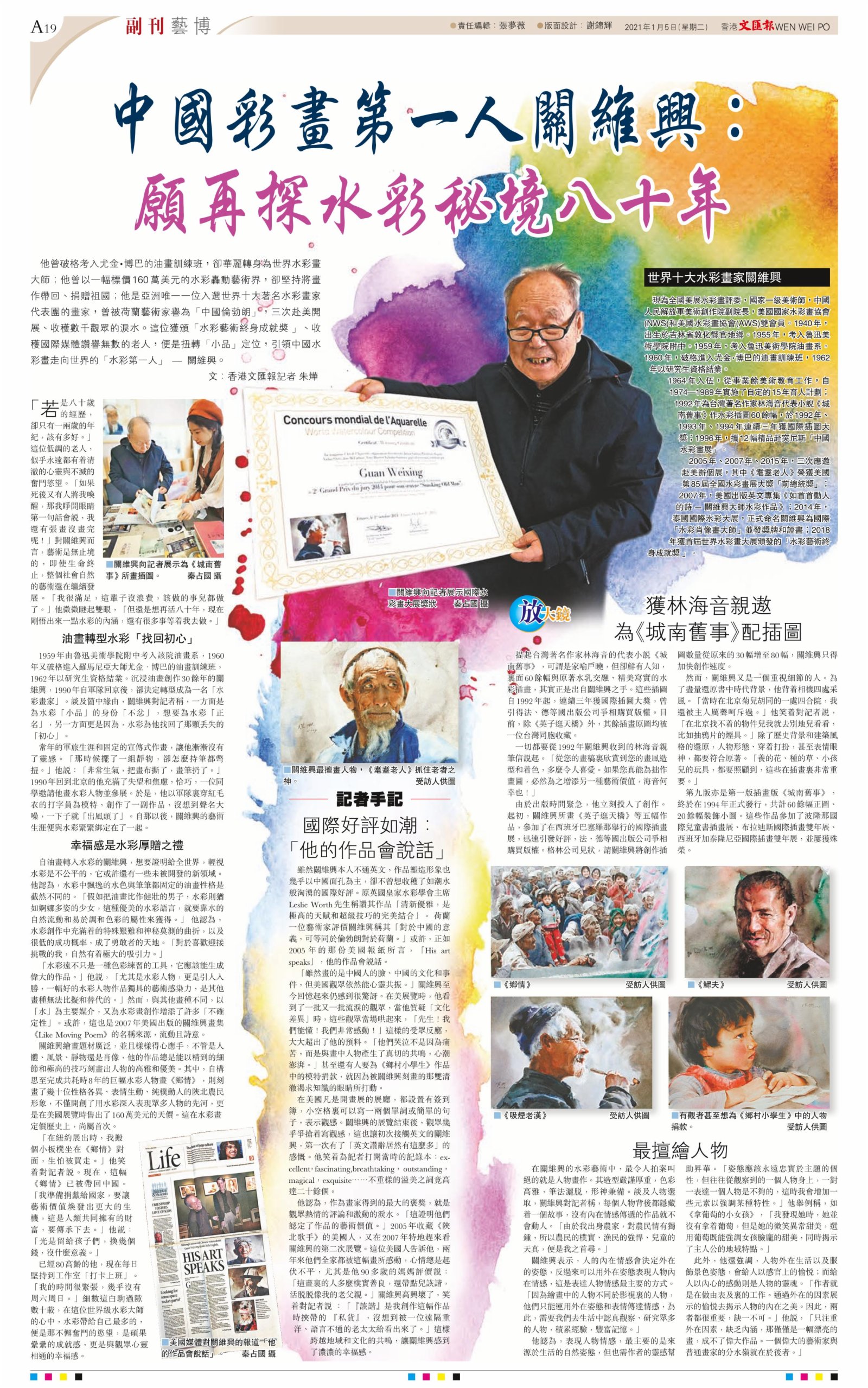(香港文匯報記者 朱燁)他曾破格考入尤金·博巴的油畫訓練班,卻華麗轉身為世界水彩畫大師;他曾以一幅標價160萬美元的水彩轟動藝術界,卻堅持將畫作帶回、捐贈祖國;他是亞洲唯一一位入選世界十大著名水彩畫家代表團的畫家,曾被荷蘭藝術家譽為「中國倫勃朗」,三次赴美開展、收穫數千觀眾的淚水。這位獲頒「水彩藝術終身成就獎 」、收穫國際媒體讚譽無數的老人,便是扭轉「小品」定位,引領中國水彩畫走向世界的「水彩第一人」-關維興。