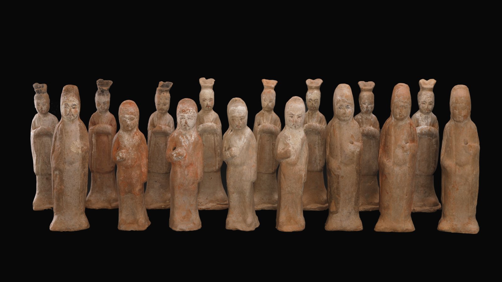 此次發掘的編號為M13的唐墓是一座帶有圍溝兆域和封土的5天井單室磚券墓,墓葬南北水準總長42.5米,由斜坡墓道、5個過洞、5個天井、4個壁龕、甬道和墓室組成。墓室為明壙磚券,穹隆頂已坍塌,墓葬內共出土各類隨葬遺物102件(組),多為放置在壁龕內的騎馬俑和立俑。
