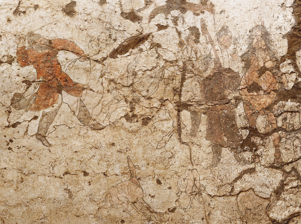 (大文新聞網記者 李陽波 西安報道)「壁畫所繪人物、動物形象生動,用筆流暢,其意趣獨特、構圖新穎,是較為罕見的唐墓壁畫題材。」記者9日從陝西省考古研究院獲悉,該院近日在對陝西西咸新區空港新城布里村北兩座唐墓所進行的考古發掘中,出土一批精美唐墓壁畫。特別是其中一副罕見的《胡人馴馬圖》,其所繪內容不僅與墓主唐朝馬政官員和粟特部族後裔等身份驚人的吻合,真實再現了墓主人的生前生活,同時也讓今人有機會一窺千年之前大唐的輝煌與繁榮。