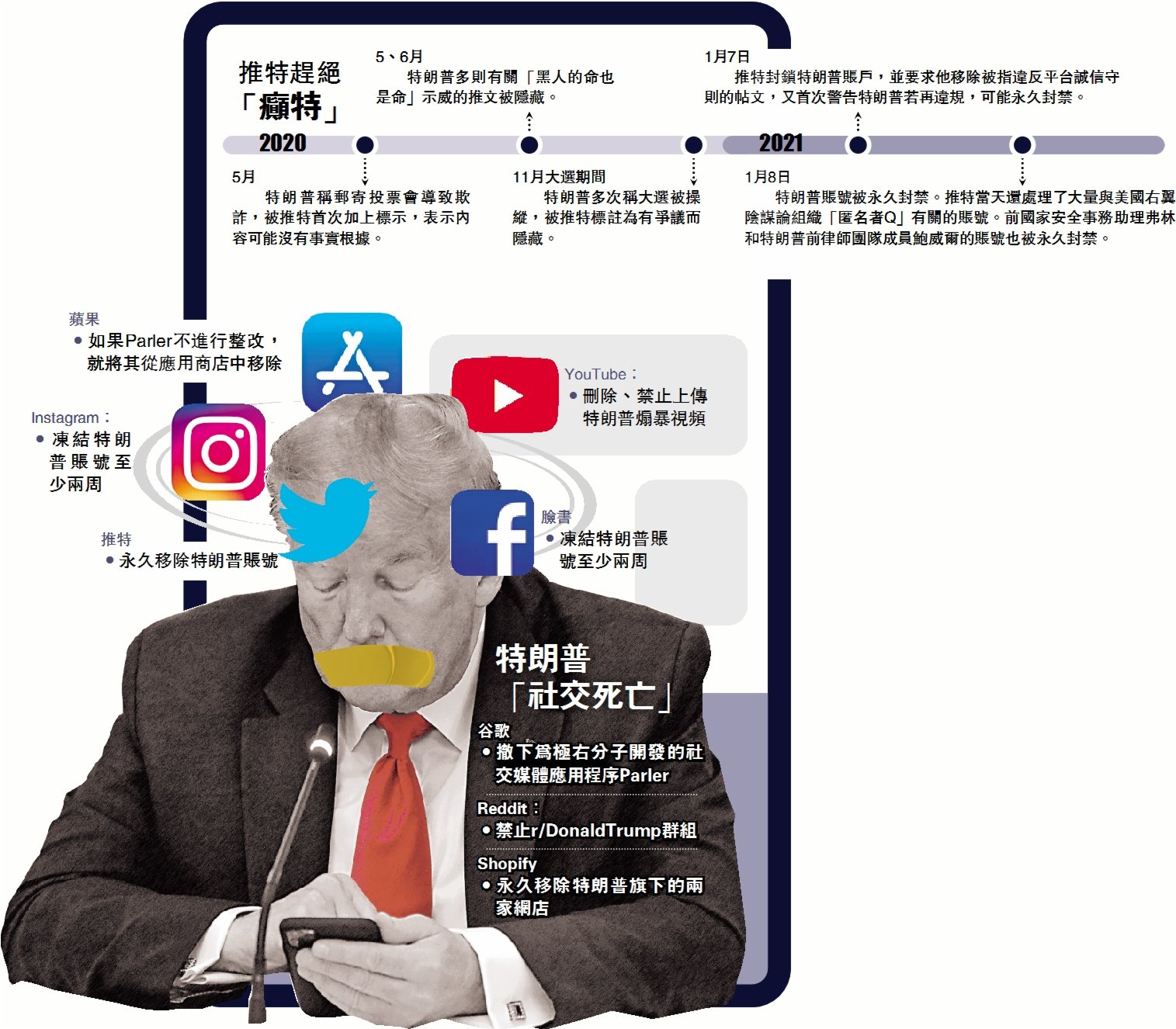 (大公報記者 公孫淑)美國社交網站推特(Twitter)8日以可能進一步煽動暴力為由,永久封禁美國總統特朗普的個人賬戶(@realDonaldTrump),此前另一社交媒體巨頭臉書(Facebook)已宣布停用特朗普的賬號。對比2019年大批香港黑暴賬戶被放生,凸顯這些美國社交媒體巨頭壟斷網上話語權,採取雙重標準,操控封鎖賬號生殺權,而特朗普當初打壓封殺TikTok和微信,無疑自打嘴巴。