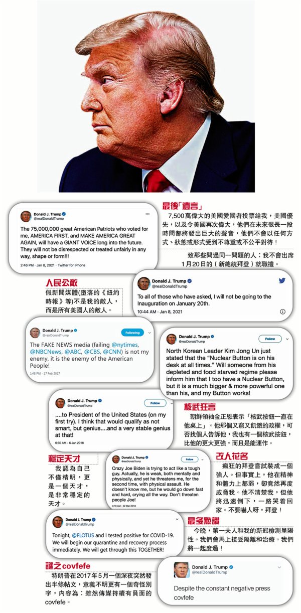 香港文匯報綜合報道,美國總統特朗普煽動支持者襲擊國會後,社交網站twitter前日終於以煽動暴力為由,永久封鎖特朗普個人及其競選團隊賬號,多名特朗普支持者及散播QAnon陰謀論的賬號,亦同時遭到永久封殺。twitter是特朗普最常用的社交媒體,自2016年大選起該平台就成為特朗普最具影響力的發聲渠道,也是他最大政治資產之一。分析認為,twitter及日前facebook封殺特朗普的決定,反映「言論自由」在西方也是有極限,但兩大平台過去兩年來不斷放生香港的縱暴派,亦凸顯了美國的雙重標準。