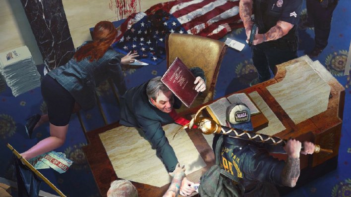 畫中最顯眼的是2個政客(小偷),其中男政客正面對著暴徒的棒束,他一手持美國憲法文本遮住頭,一手伸向特朗普支持者的背包偷出選票但被制止。相應地,女政客則成功地在一個身蓋美國國旗的死屍身上偷取了一張選票。