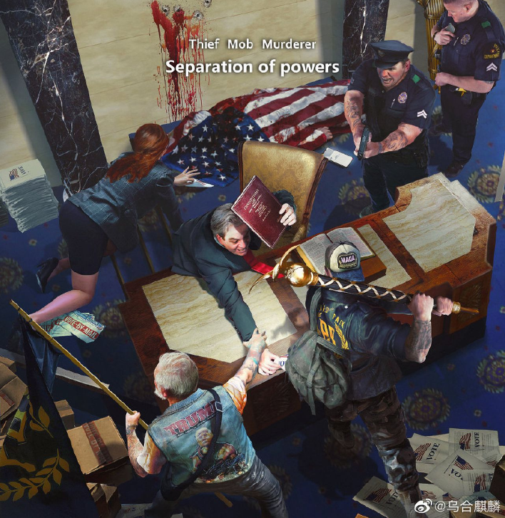 首先受到中國網民們關注的是畫中的6個人(不含屍體)、3種形象。其中,分別是2個政客、2個警員和2個衝入國會大廈的特朗普支持者。畫中還配文「Thief Mob Murderer Separation of powers」,意即「小偷、暴徒、殺人犯分權制」。