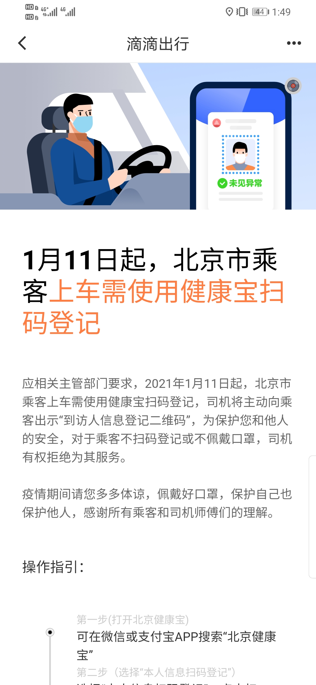 乘客佟先生表示,他在今天打開滴滴APP時看到了首頁彈出的通知,要求乘客上車使用健康寶掃碼登記,對此他表示認同,但比較擔心平台對司機的監管不夠,「我自己都會準備消毒濕巾,在上下車後對雙手消毒,並堅持全程佩戴口罩」。他認為,北京疫情防控措施嚴格,網約車司機是疫情防控的一個重要群體,北京對這一群體嚴管嚴控的做法,也值得其他省市學習,「身為在北京工作的河北人,這些天最關心的就是老家疫情,也深切感受到兩地在疫情防控和發布上還是有差距,希望老家多向北京取取經,早點取得抗疫勝利。」