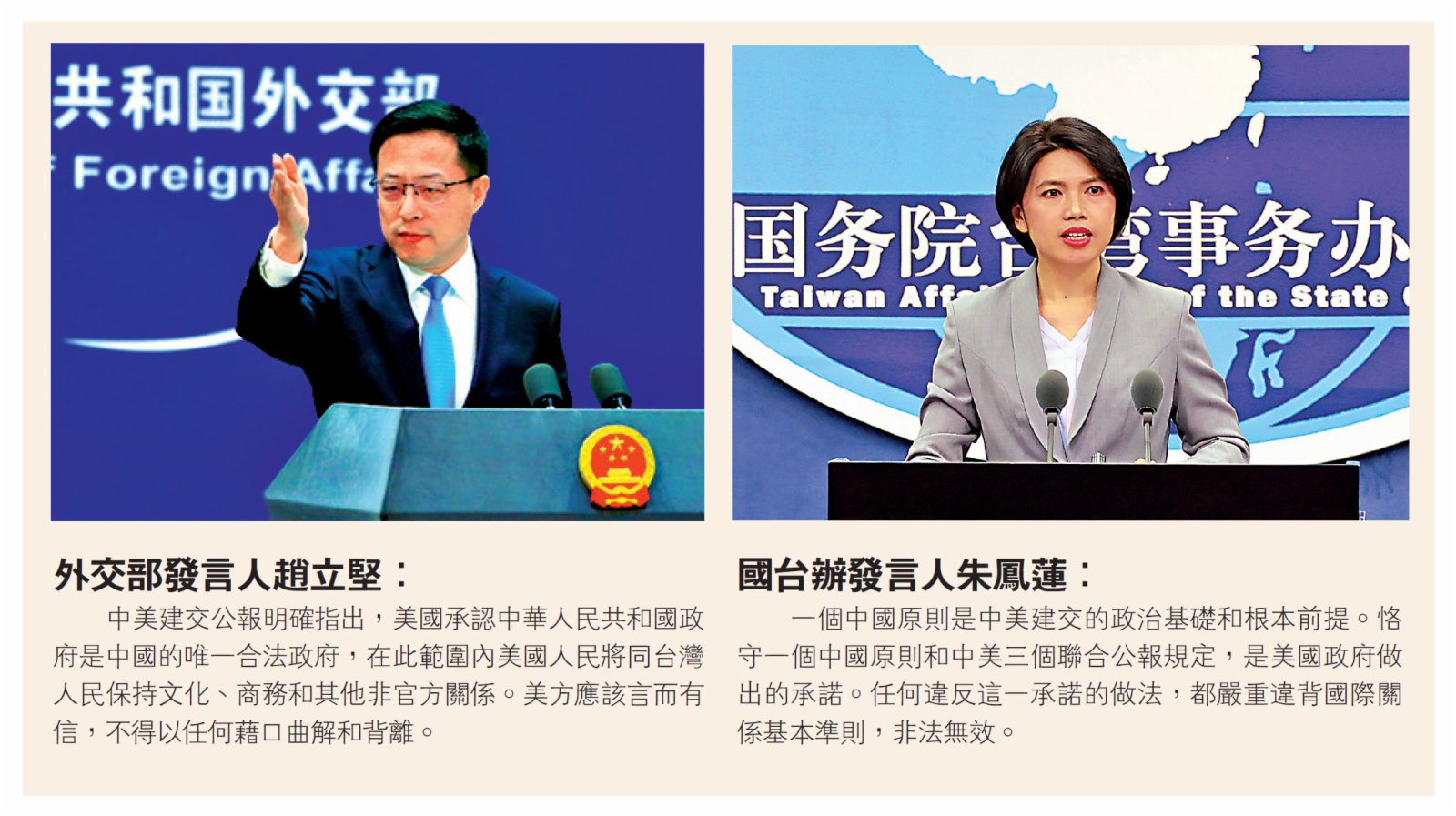 「美方所謂『與台灣關係法』嚴重違反一個中國原則和中美三個聯合公報規定,中方從一開始就堅決反對。」趙立堅說,「在台灣問題上,美方應該遵守的是一個中國原則和中美三個聯合公報規定,而不是美方單方面搞的什麼『與台灣關係法』。」