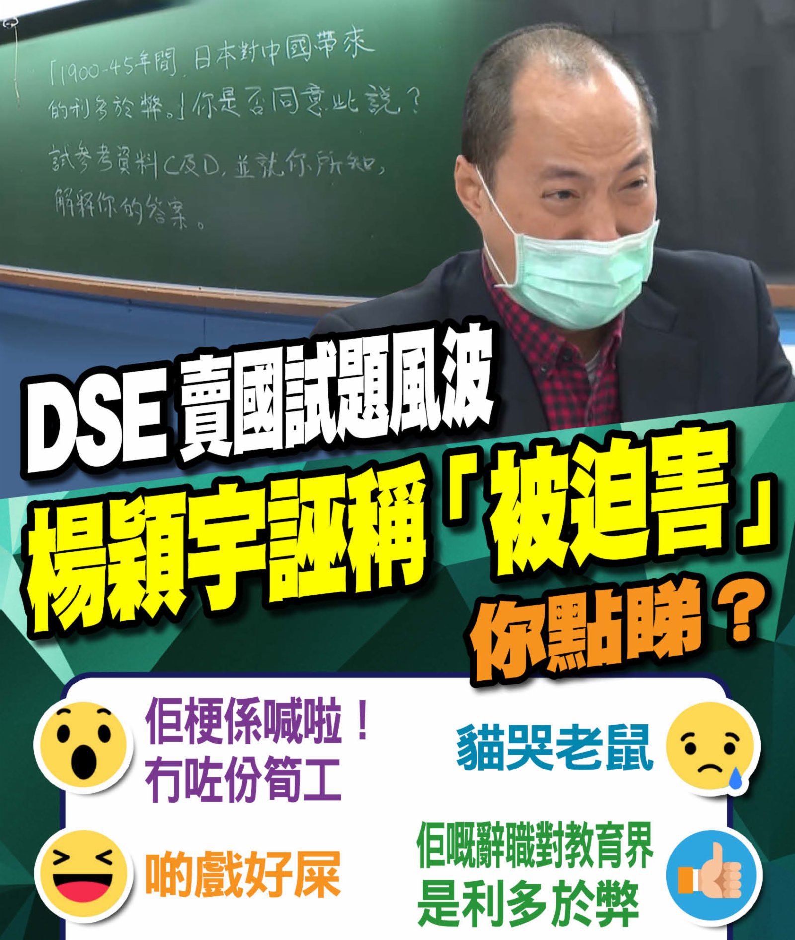 大公文匯全媒體報道,涉及上屆中學文憑試歷史科一道日本侵華「利大於弊」的冷血試題,已離職的「黃高層」、考試及評核局評核發展部經理楊穎宇,連日接受傳媒訪問時,多次聲淚俱下地稱受「政治壓力」而辭職云云,但就從未回就教育局調查報告的內容作過回應。他更於日前深夜發表聲明,高調宣稱遭人「冒認」寄信、「為保護家人安全而謝絕受訪」云云。