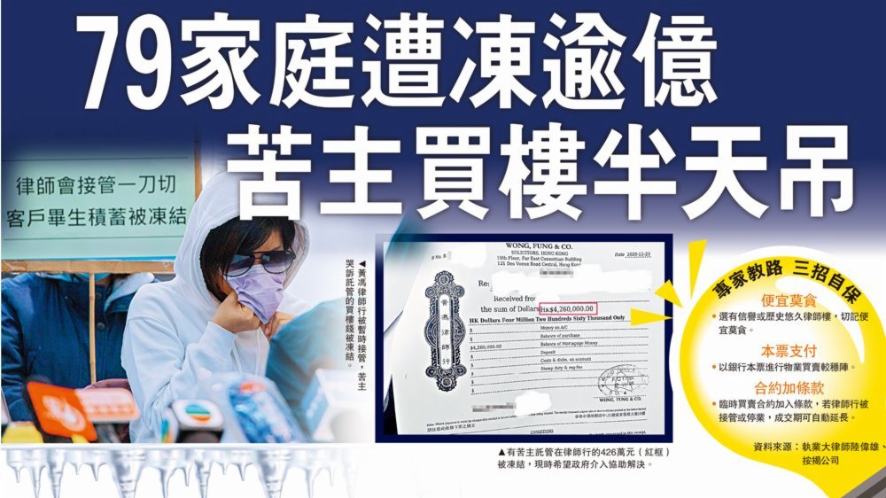 第二點疑問是,黃馮律師行一名前文員涉挪用該行客戶款項,香港律師會按《法律執業者條例》第159章接管黃馮律師行的業務。可是,對被無辜牽涉其中的過千名苦主,又有沒有責呢?舉例,既然是前文員,可不可以不凍結解僱文員後的入賬款項呢?受影響者涉及一層樓,少則幾十萬,一般也300至900萬,對平常小市民而言已是不小的一筆錢。