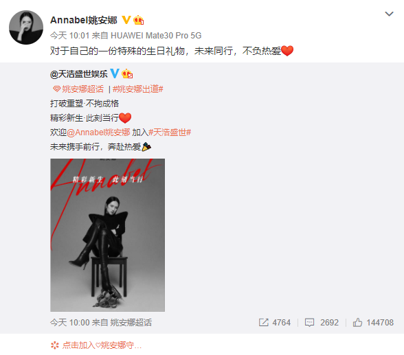 內地娛樂經紀公司天浩盛世娛樂在官方微博宣布,姚安娜加入天浩盛世,同時曬出題為「破格公主」的官方海報。姚安娜隨後轉發了微博並表示,「簽約天浩盛世娛樂是對於自己的一份特殊的生日禮物,未來同行,不負熱愛」。微博中還公開了她出道的紀錄片,紀錄片中是她從小到大的成長曆程。