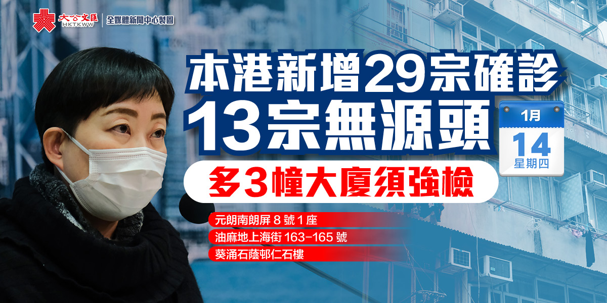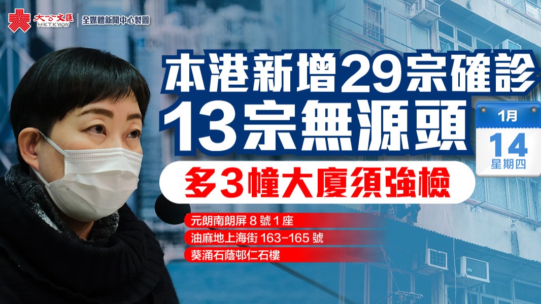 大公文匯全媒體報道,本港新冠肺炎疫情持續,衞生防護中心傳染病處主任張竹君今日(14日)下午在疫情記者會上表示,截至今日凌晨零時,本港新增29宗確診個案,包括3宗輸入個案及26宗本地個案。個案涉及16女13男,年齡介乎2個月至81歲,10宗個案經臨時檢測中心找出。今日另有30多宗初步陽性個案。