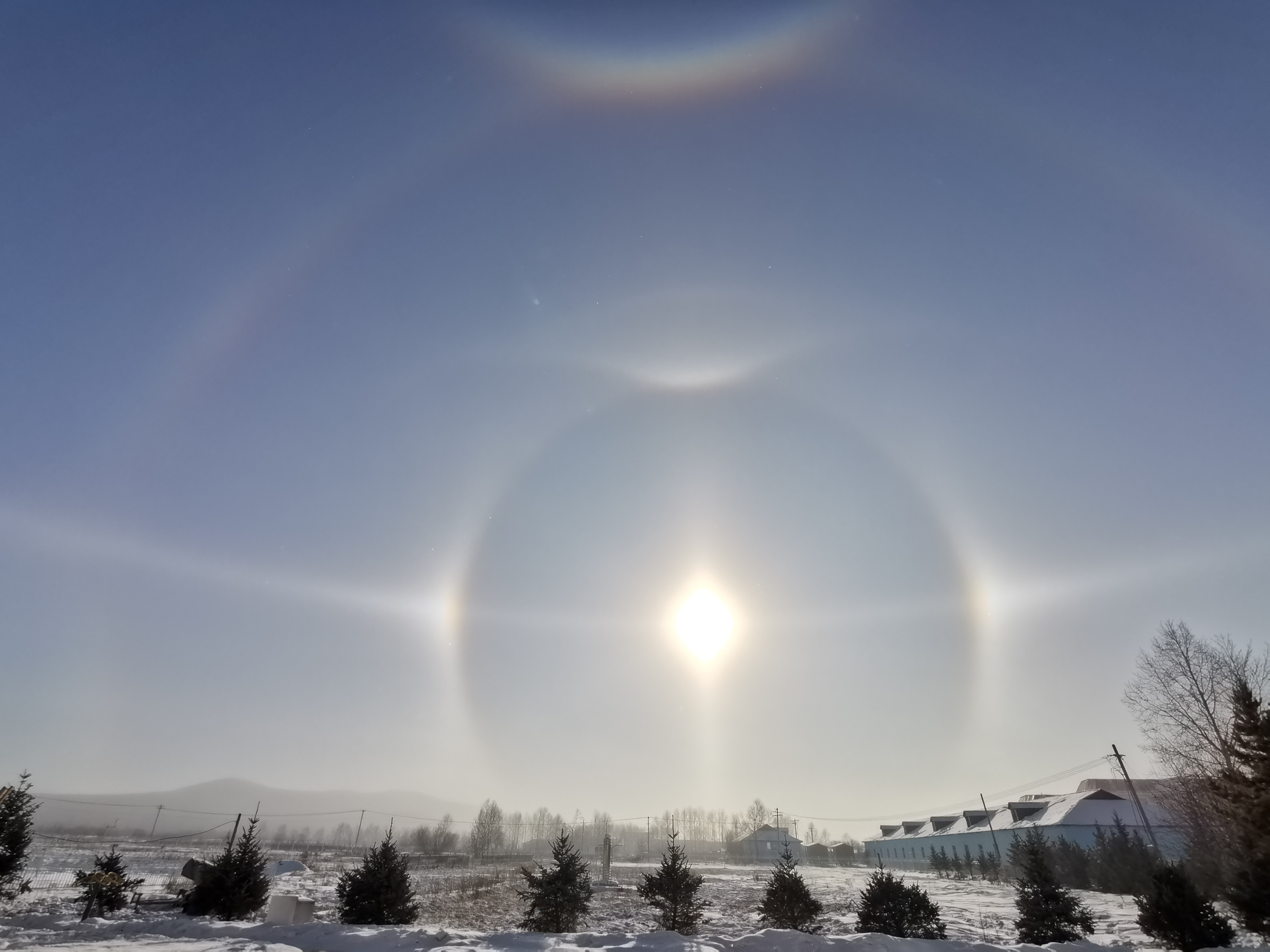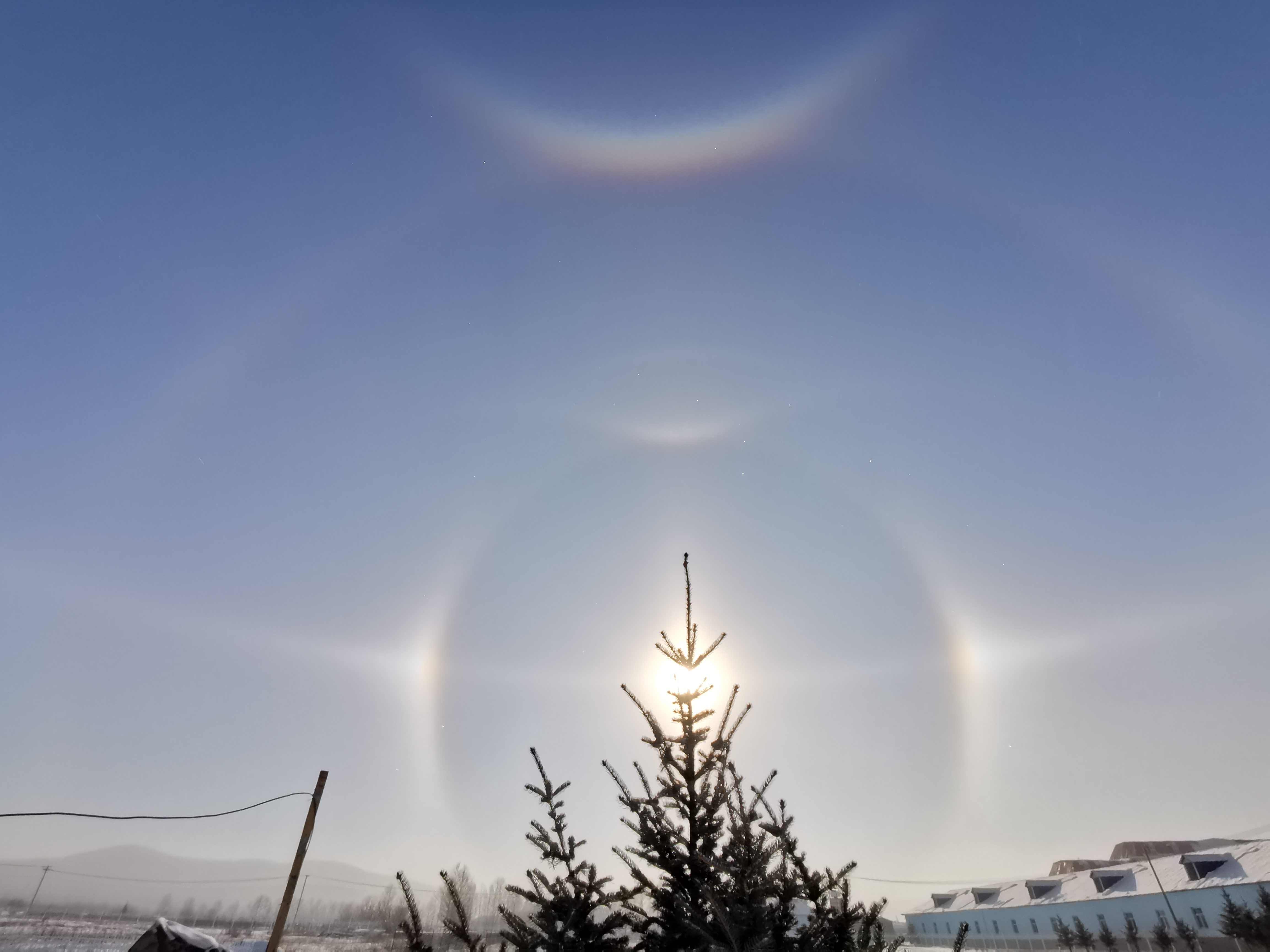 (大文新聞網記者喬輝、王月)1月15日,內蒙古呼倫貝爾市牙克石市圖里河鎮出現罕見組合冰暈,不僅出現了幻日和環天頂弧,而且出現了幻日環、Parry弧、Lowitz弧、22°日暈、44°日暈和上切弧。環天頂弧在空中如同笑臉一般,非常漂亮。