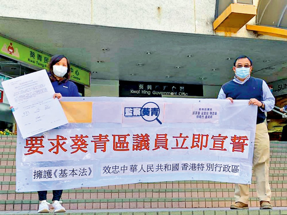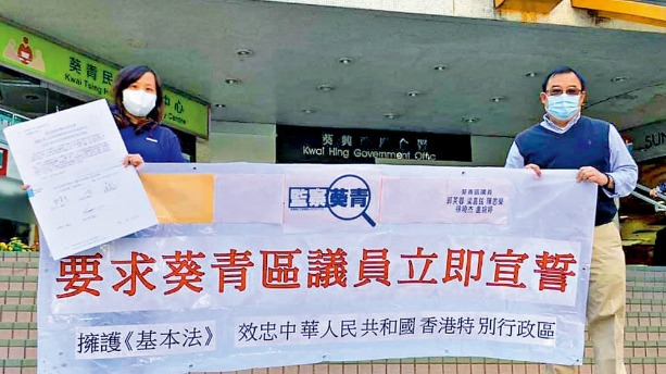 此外,葵青建制派區議員盧婉婷、梁嘉銘、郭芙蓉、陳志榮及徐曉杰昨日早晨向葵青民政署專員遞交請願信,要求盡快落實區議員宣誓安排。