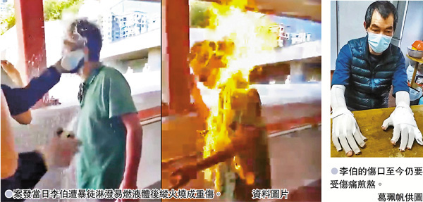 前年11月11日,黑衣暴徒在全港發動堵路、破壞港鐵站等交通運輸設施,強迫市民參與所謂的「大三罷」。當日中午時分,一批黑衣暴徒在馬鞍山港鐵站大肆破壞,其間58歲退休人士李伯嘗試阻止黑衣人搞破壞,但被群煞尾追襲擊。李伯逃到馬鞍山廣場連接馬鞍山公園的行人天橋時,被黑衣人和所謂的「街坊」包圍辱罵。未幾,一名黑衣人突然衝向李伯,向他淋潑易燃液體,更用打火機點火。李伯瞬間變「火人」,身體及頭部五成皮膚三級燒傷,一度命危,涉案黑衣火魔逃離現場。