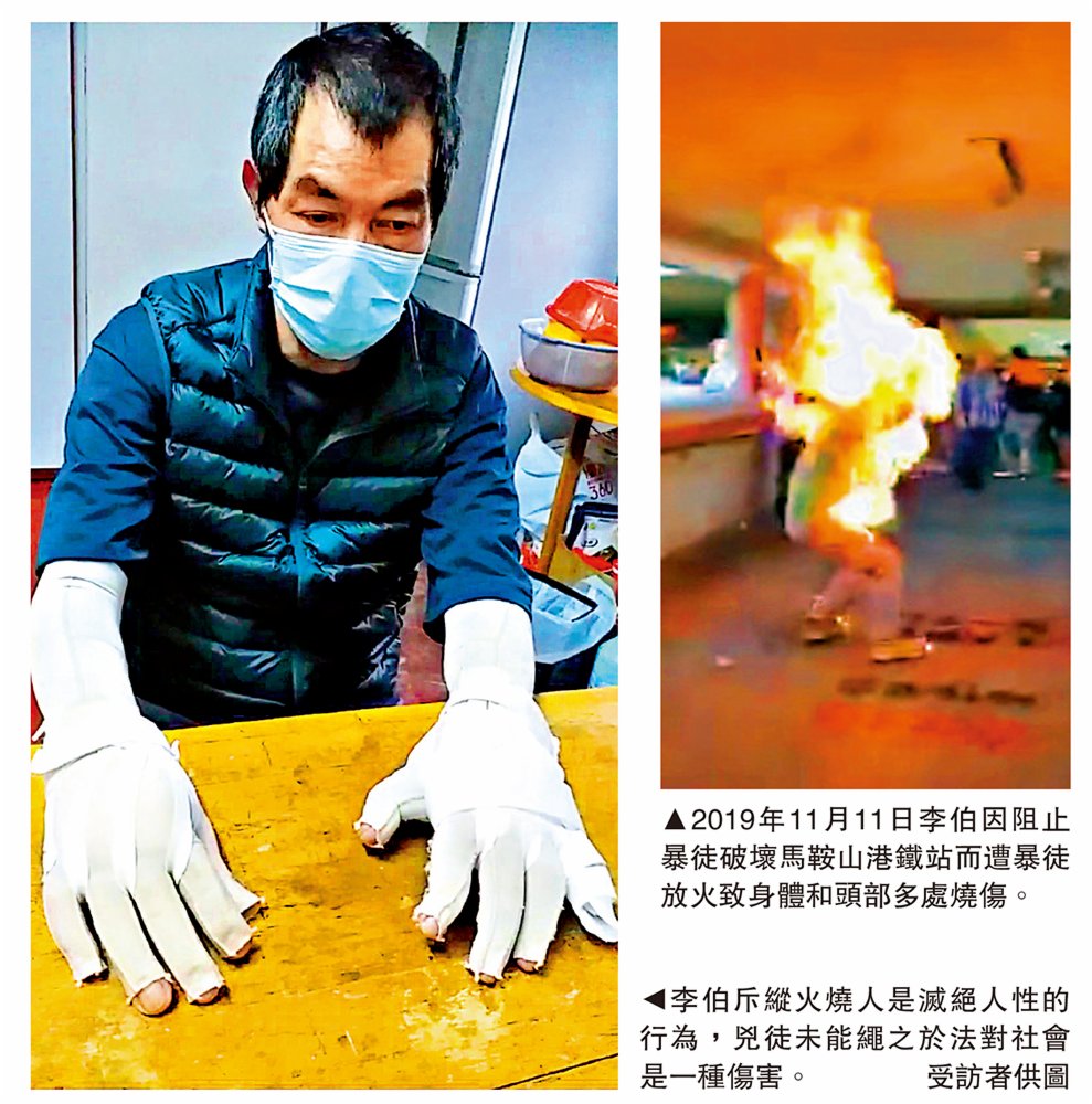 (大公報 記者 黃浩輝)馬鞍山黑暴火燒人慘案發生超過一年,被暴徒嚴重燒傷的李伯情況一度危殆,經過四次植皮手術及漫長治療,至今仍未完全康復;警方鍥而不捨調查,相信兩名涉案縱火及其同黨去年已潛逃到台灣,現正被警方通緝;警方同時發現有人協助兩人購買機票,前日分別在柴灣及元朗拘捕該兩名涉協助逃犯的男子。李伯昨日表示縱火燒人是滅絕人性的行為,兇徒未能繩之於法對社會是一種傷害,希望最終會拉到人。