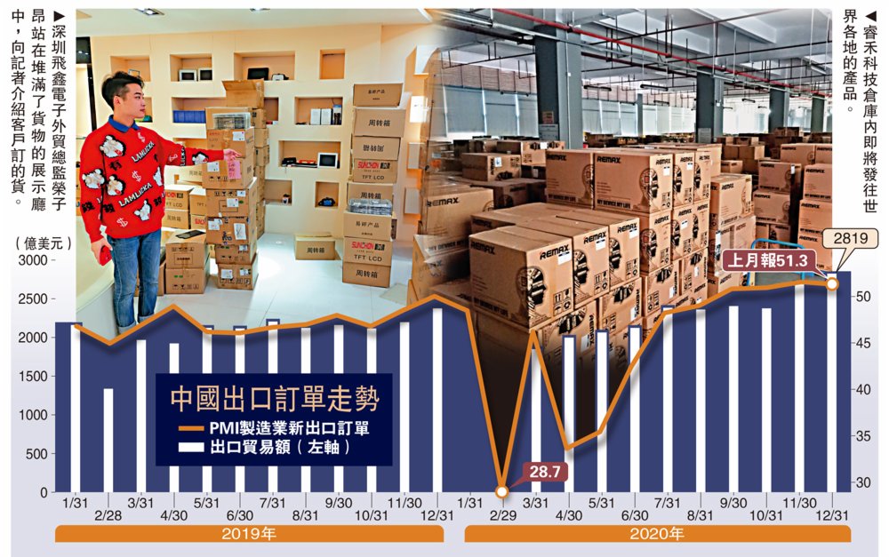 (大公報 記者 毛麗娟、何花)歐美疫情的不確定性,令訂單大舉回流中國。在深圳飛鑫電子位於深圳龍華區的一個電子產業園,工人們三班倒,倉庫裏堆滿了「整裝待發」的貨箱,原本陳列用的展廳也被拿來堆放各種貨品。坐在大公報記者面前的深圳飛鑫電子外貿總監榮子昂一邊接受採訪,一邊還要忙着應付客戶催貨,同時和物流公司訂貨櫃。「去年年初疫情嚴重時,外貿行業很難。當時想到了下半年可能會復甦,但沒想到這麼火爆。」
