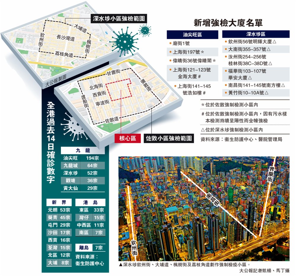 (大公報記者 伍軒沛、方學明、胡家俊)新冠肺炎確診近日激彈,政府日前於佐敦、油麻地劃出首個「強檢小區」後,昨日再增加兩項措施:在佐敦小區內劃出「核心區域」,以及在深水埗劃出第二個「強檢小區」。佐敦小區內70幢樓宇,無論有否出現確診,一概納入強制檢測名單;深水埗小區六幢樓宇因有確診個案,全幢須強檢。