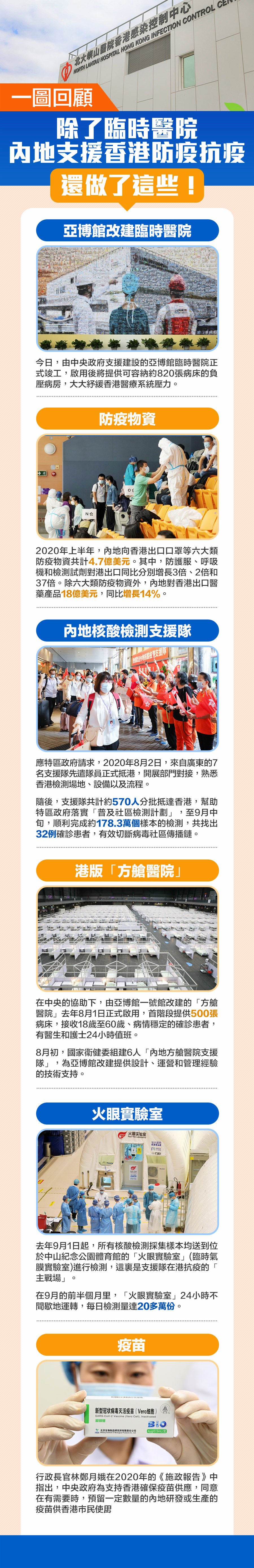 大公文匯全媒體報道,由中央援建的亞博臨時醫院今日(20日)竣工交付,啟用後可提供約820張負壓病房,將大大紓緩香港醫療系統的壓力。自香港爆發新冠肺炎疫情以來,中央一直高度關注香港的疫情發展,積極回應特區政府提出的各項請求,除了援建亞博館臨時醫院,在物力方面,中央對港僅半年就輸送口罩等六大防疫抗疫物資超過4.7億美元;在人力方面,中央積極調遣近600人手,組建核酸檢測和「方艙醫院」支援隊,搭建火眼實驗室。為普及社區檢測,阻斷隱性傳播鏈,支援隊員爭分奪秒,不分晝夜,為香港市民做核酸檢測。中央還承諾,會在香港有需要的時候,預留一定數量的內地研發或生產的疫苗供香港市民使用。