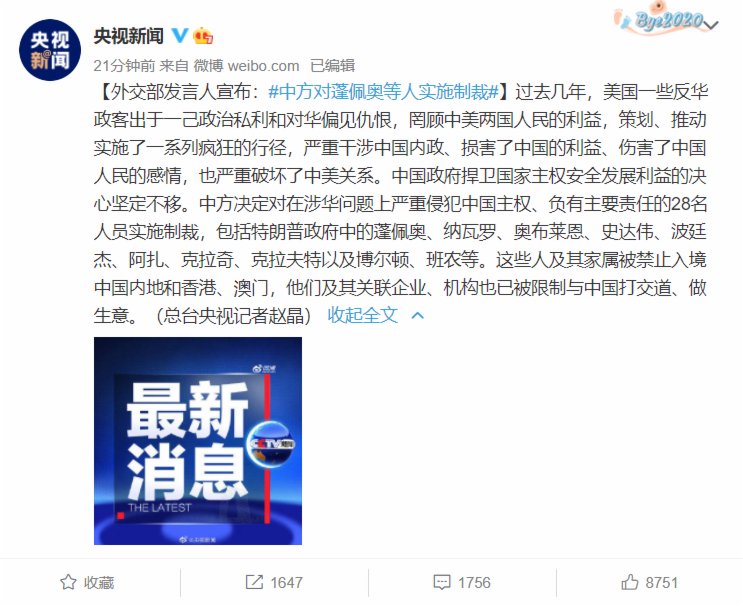 大文新聞網報道,美國一些反華政客在過去幾年一直推動一系列瘋狂行徑干涉中國內政、損害中國利益。1月21日凌晨,外交部發言人宣布中方決定對在涉華問題上嚴重侵犯中國主權的人員實施制裁,包括特朗普政府中的蓬佩奧等28名人員。