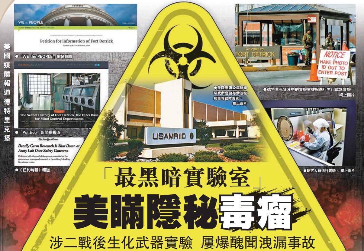 香港文匯報綜合報道:自從美國去年初爆發新冠疫情以來,美國政界經常有人無理指控新冠病毒「源於中國武漢實驗室」,不過事實上,美國政府在國內外無數生物實驗室,才是最常發生洩漏事故的地方,其中尤以馬里蘭州德特里克堡最為臭名昭著。其中的實驗室於2019年7月被美國政府要求暫停對病原體的研究工作,但實驗室卻以「國家安全」為由,拒絕披露有問題的細節。該實驗室過往亦經常被指進行生化武器實驗、以至精神控制實驗等。