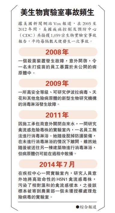 美國國內的生物實驗室頻頻發生高危事故,存在巨大安全隱患。疾病控制及預防中心(CDC)早在2012年便發表報告,指出全美生物實驗室涉及微生物洩漏,造成「可導致嚴重疾病」的事故數目激增,從2004年的16宗升至2010年的269宗。若不進行徹底消毒,致命微生物極可能感染員工,甚至造成病毒擴散。