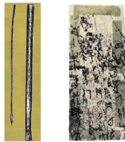 此外,西周時《大盂鼎》銘文、昭王以後《毛公鼎》和《散氏盤》上的金文,字的結體、筆法行氣,貫串自然,一氣呵成,是圓筆中鋒所為,若非先用筆打草稿才刻鑄,實無法達至這樣嚴謹的書法和圓轉順暢的效果。我國甚古的文字殷墟甲骨文(見附圖右半部),在出土的三塊牛胛骨板上,有用毛筆寫成的文字,龜甲片上也有施朱塗墨的筆痕,足證我國先民三千多年前,已懂得造筆寫字;而甲骨文和金文也同樣出現「聿」字(「筆」字的原型)。