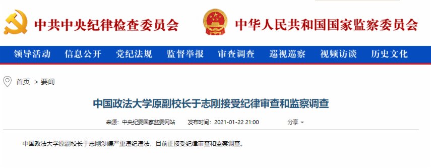 據中央紀委國家監委網22日晚消息,中國政法大學原副校長于志剛涉嫌嚴重違紀違法,目前正接受紀律審查和監察調查。