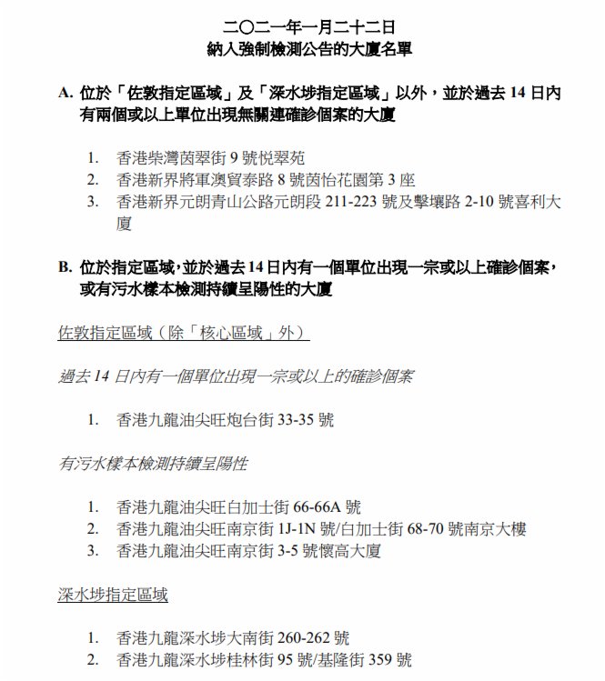 港府決心加強「須檢必檢」的力度,以盡快切斷社區的傳播鏈。1月20日至1月22日,強制檢測涵蓋的大廈及地點如下: