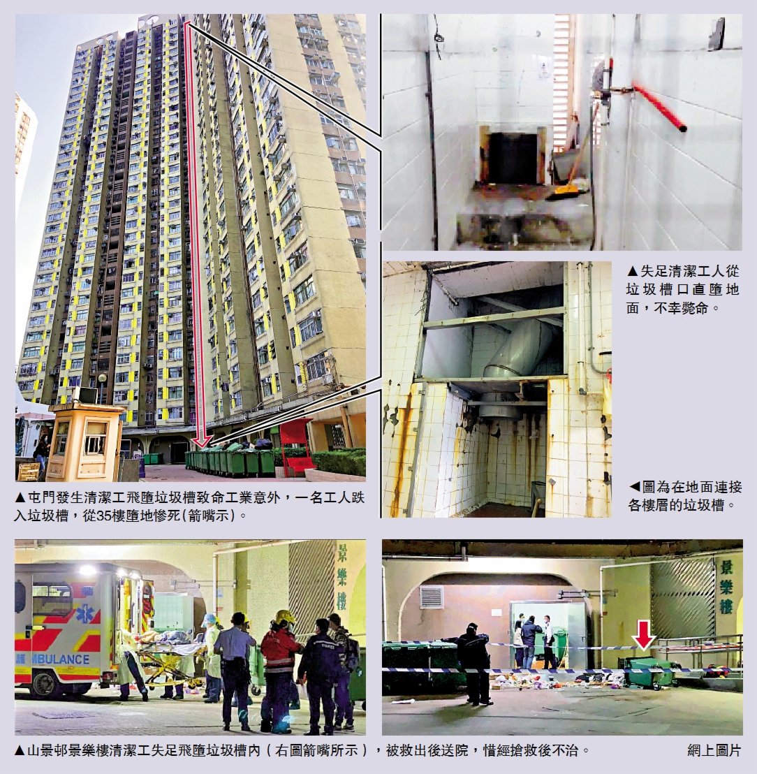 入職約三個月、58歲關姓兼職清潔工,前晚在山景邨35樓垃圾房倒垃圾時,疑失平衡跌進垃圾槽,直墮地下一個大垃圾箱內,兩小時後工友發現報警,惜他在送院搶救後不治。據悉,關患有腦癇症,關母哭訴兒子是孝順仔,曾對兒子說疫下做清潔工作太危險,勸他不要做,詎料一語成讖。
