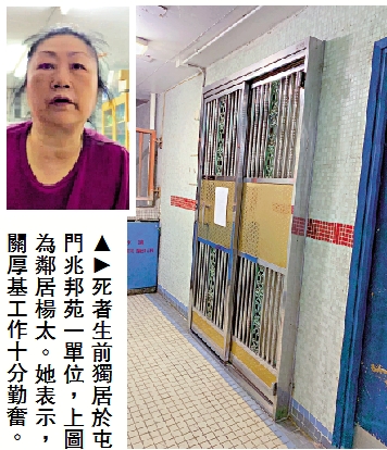大公報記者昨日到關厚基位於兆邦苑寓所了解,大門上貼有警方的通告,呼籲死者的親友盡快與警方聯絡,以便安排身後事。對面鄰居楊太表示,關在上址居住十多年,平日出街均有與她打招呼,印象中關工作勤奮,楊太得知關患有腦癇症後,着他「不如申請綜援啦」,關指自己還年輕,覺得要靠自己,故未有打算申請綜援。