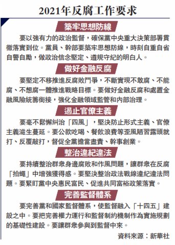 習近平指出,要堅定不移推進反腐敗鬥爭,不斷實現不敢腐、不能腐、不想腐一體推進戰略目標。要持續壓實金融管理部門、監管機構和地方黨委、政府主體責任,做好金融反腐和處置金融風險統籌銜接,強化金融領域監管和內部治理。要將防腐措施與改革舉措同謀劃、同部署、同落實,推進重點領域監督機制改革,有針對性地補齊制度短板。各級領導幹部要帶頭遵守黨紀國法,自覺反對特權思想、特權現象,帶頭廉潔治家,從嚴管好家屬子女和身邊工作人員。