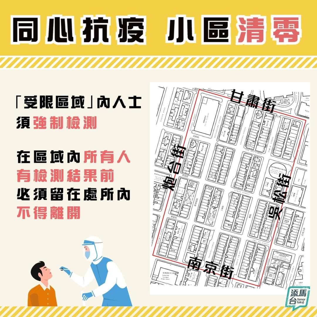 政府首次實施「留在原處所」檢測令,圍封小區展開更進一步的「須檢必檢」行動,並爭取在48小時內完成。另外,政府會為行動不便的人士和長者,包括安老院舍的院友安排上門採樣或自行採集深喉唾液樣本。同時,政府會為居民準備簡單食物及清潔用品。