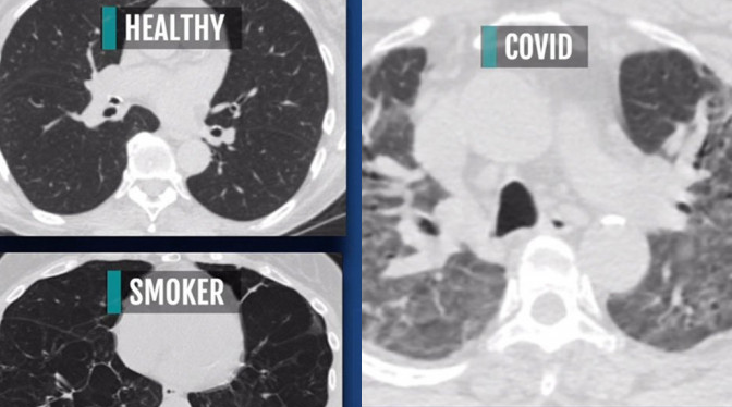 米蕭德對比3張斷層掃瞄影像,分別為一般人、吸煙者,以及新冠患者的肺部狀態。她指出,一般人的肺部X光片應該是大部分呈現黑色,代表充滿空氣;而吸煙者的肺部則有部分白點;至於新冠肺炎患者的肺部,則幾乎是一片白色的嚴重「傷疤」,並指這些白色「傷疤」就像是混凝土,會影響氧氣進入肺部。