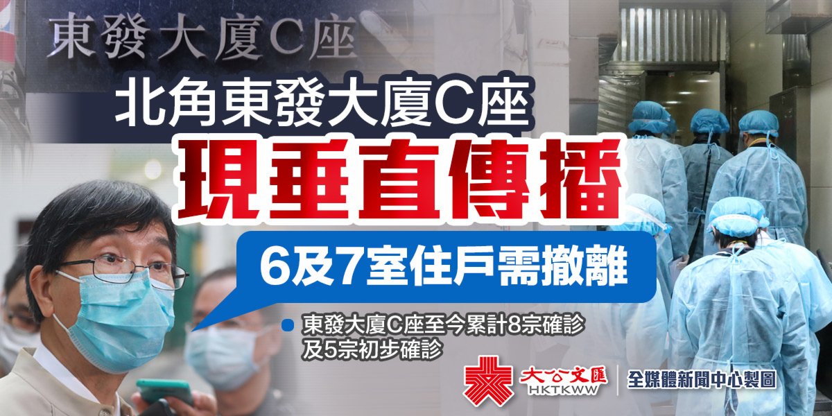 資料顯示,東發大廈C座最早1宗個案是1名94歲男病人,本月14日發病,18日確診。該大廈疑有持續傳播發生,今日新增4宗確診及5宗初步確診個案。