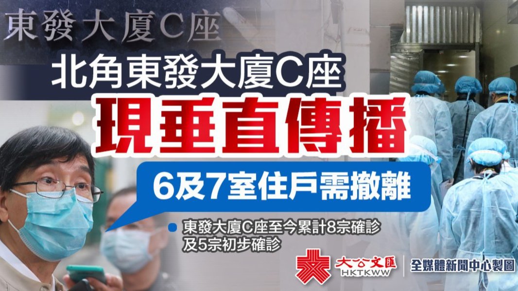 大公文匯全媒體報道,香港新冠肺炎疫情持續,北角東發大廈C座日前因出現兩宗或以上無關連的新冠病毒確診個案,須進行強制檢測,至今累計8宗確診及5宗初步陽性個案,共涉及8個單位。政府專家顧問、港大微生物學系講座教授袁國勇今日(27日)到現場視察後,指東發大廈C座相信出現垂直傳播,6室及7室所有住戶需要撤離。