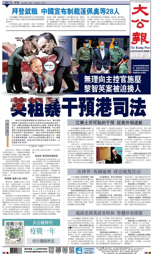 大公報報道,前年8‧18反修例「流水式集會」未經批准集結案中,現正在赤柱監獄還押的壹傳媒黎智英與另外8名人士被起訴,案件將於2月16日開審。政府早前邀請英國御用大律師David Perry來港擔任黎智英維園非法集結案的主控官,但英國外相藍韜文及前外相聶敬偉等政客接連施壓。有傳他因受壓而退出案件。香港律師會發表聲明,譴責試圖以壓力阻礙律師正當運作,及干預律政司刑事檢察權力的行為。
