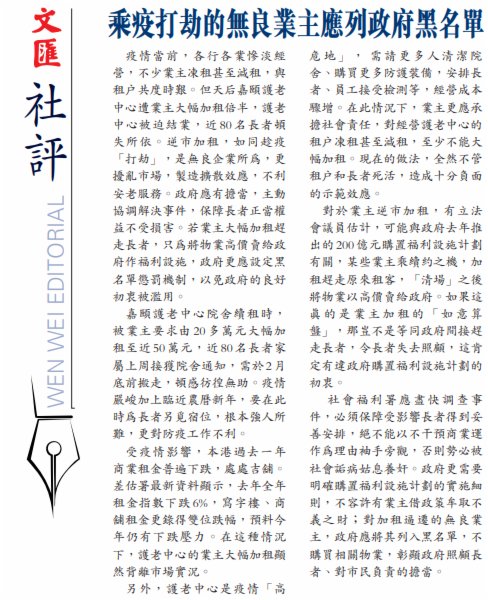 另外,護老中心是疫情「高危地」, 需請更多人清潔院舍、購買更多防護裝備,安排長者、員工接受檢測等,經營成本驟增。在此情況下,業主更應承擔社會責任,對經營護老中心的租戶凍租甚至減租,至少不能大幅加租。現在的做法,全然不管租戶和長者死活,造成十分負面的示範效應。