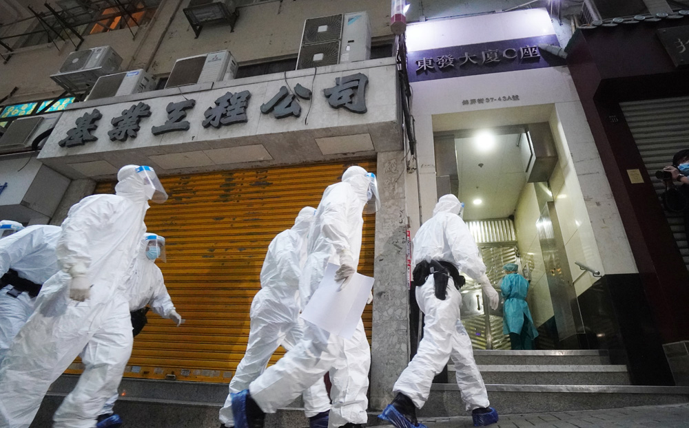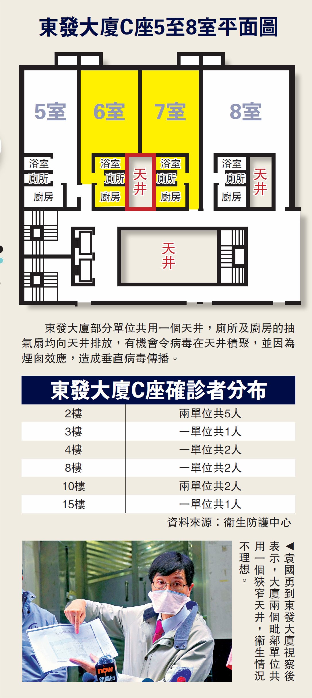 政府專家顧問、港大微生物學系講座教授袁國勇昨日到東發大廈視察後表示,大廈兩個毗鄰單位共用一個狹窄天井,有業主說有時在室內聞到臭味,相信是從天井傳來。共用天井的C座六號、七號單位出現垂直傳播,居民有感染風險,須盡快撤離。大廈環境欠理想,病毒可能迅速傳播,要盡快檢測才能截斷傳播鏈。