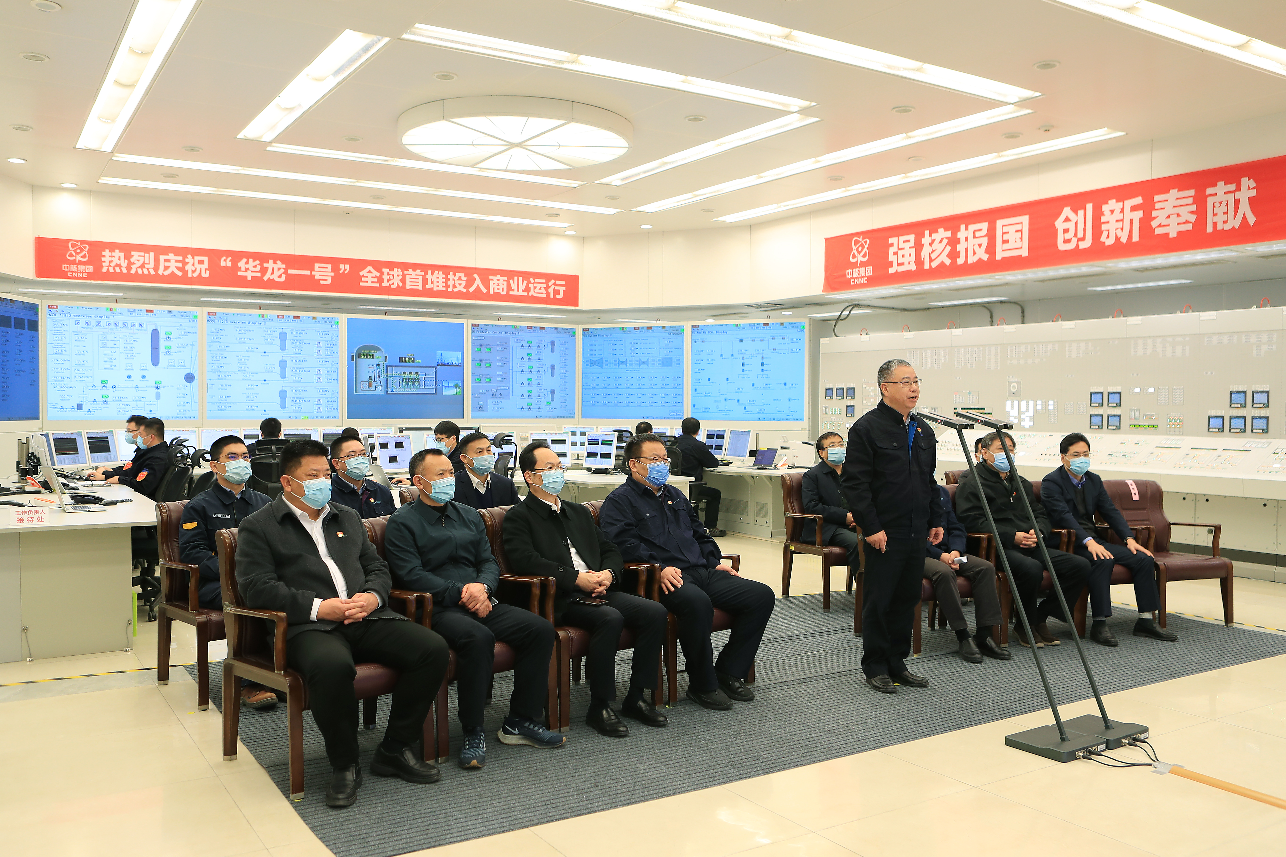 當日,國務院國資委黨委書記、主任郝鵬出席活動,並宣布華龍一號全球首堆投入商業運行。生態環境部副部長、國家核安全局局長劉華,國家能源局副局長任志武,國家原子能機構總工程師劉永德等,充分肯定了中核集團堅持自主創新取得的重要成果。