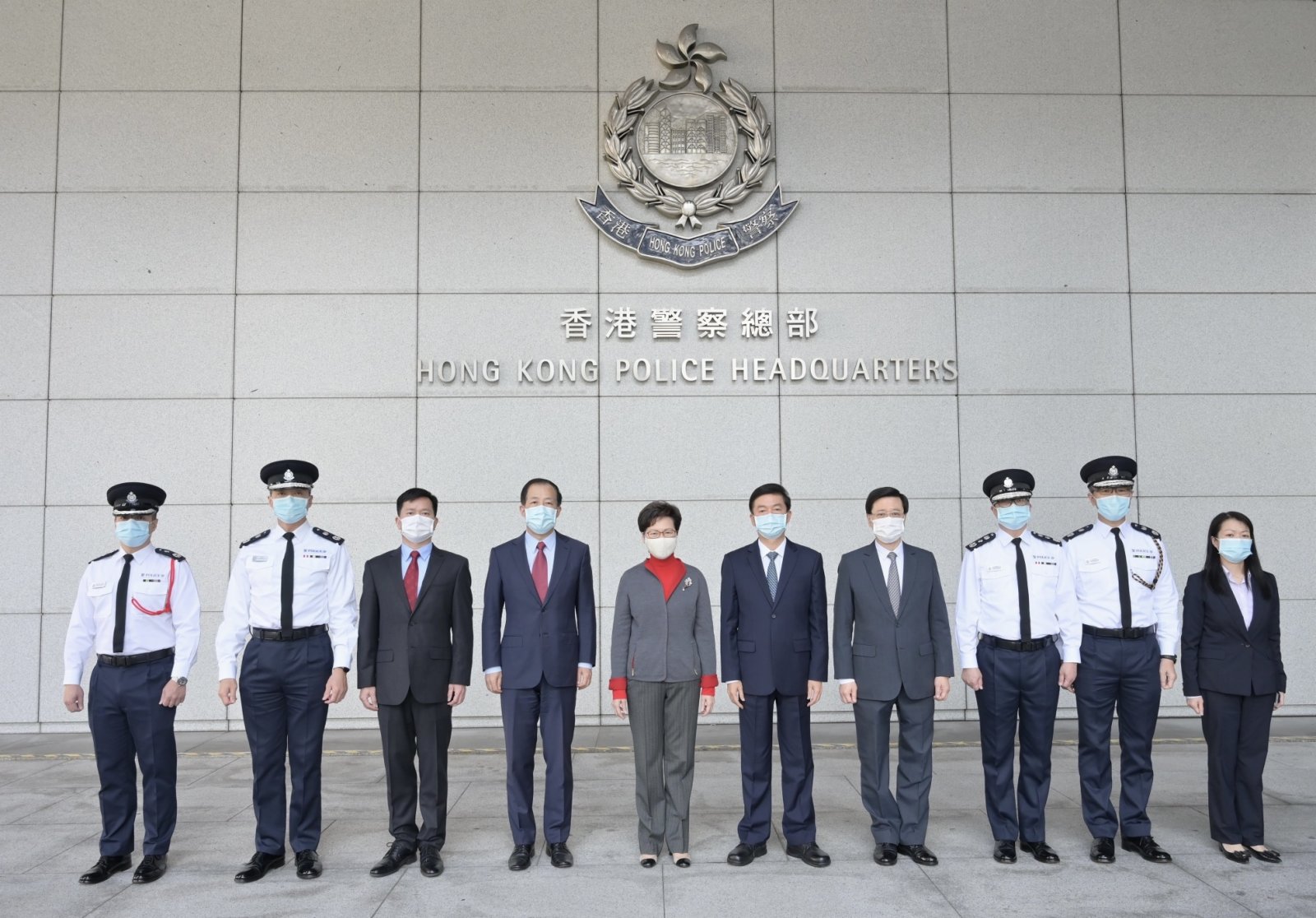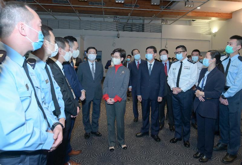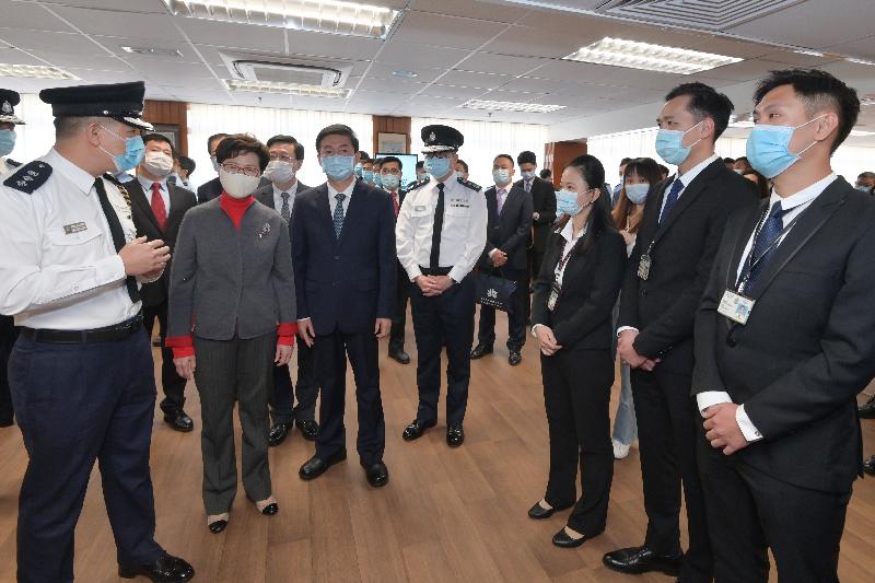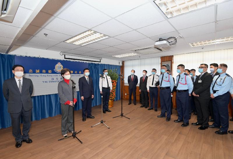 林鄭月娥一行在警務處處長鄧炳強陪同下,先後探訪灣仔警察總部和尖沙咀警署,與共百多位警務人員會面,了解他們的工作情況。她表示警務人員在過去一年,無論是在止暴制亂或防抗疫情方面,都做了大量工作,值得充分肯定;尤其是在《香港國安法》自2020年6月30日實施以來,香港警隊更肩負維護國家安全的重大責任,使命光榮。對多位執行維護國家安全任務的警隊同事受到美國政府無理的「制裁」,行政長官轉達了國家主席習近平在她上周述職期間對同事的親切關懷。