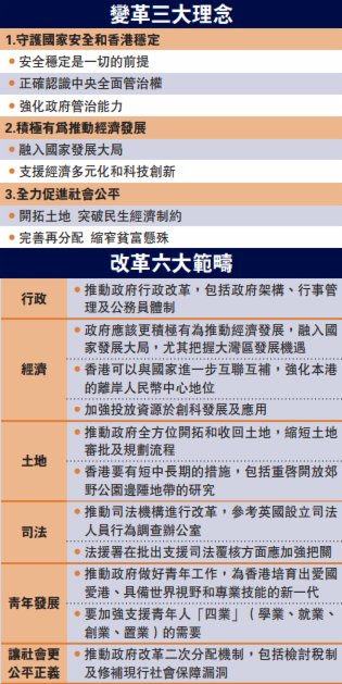 民建聯提出,從六大範疇改革香港。在行政改革方面,民建聯要求改革行政制度,包括政府架構、行事管理及公務員體制,確保政府暢順施政,消除公務員系統官僚僵化,決策程序和行政流程冗長繁複等陋習,解決政府工程成本高昂問題。張國鈞認為,強化政府管治能力,政府應該更積極有為推動經濟發展,融入國家發展大局,尤其把握大灣區發展機遇。