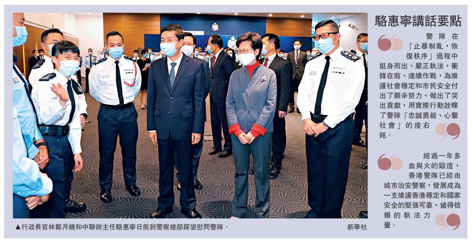 (大公報記者 海芯葆)中聯辦主任駱惠寧日前探望慰問警隊,提到「香港警隊已經由城市治安警察,發展成為一支維護香港穩定和國家安全的堅強可靠、值得信賴的執法力量。」社會各界認為,駱主任的說話反映中央對香港警隊寄予厚望,期望警隊能夠在維護國家安全方面更加努力。他們相信,警隊在黑暴和抗疫期間盡忠職守,一定可以維護香港治安及保障國家安全。