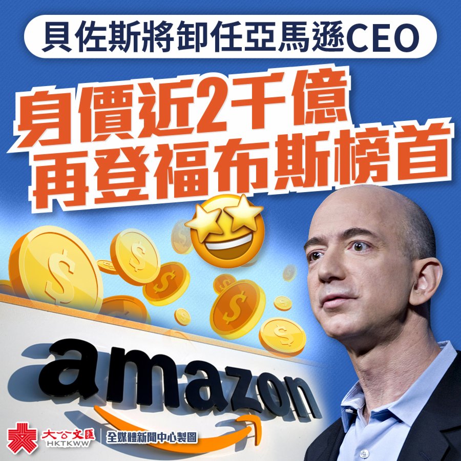 大公文匯全媒體報道,美國電子商務巨頭亞馬遜當地時間2日宣布,貝佐斯(Jeff Bezos)今年第三季度將不再擔任公司首席執行官,轉為擔任亞馬遜董事會執行主席。
