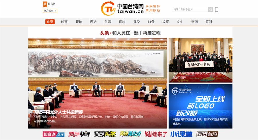大文新聞網綜合報道,中國台灣網新版首頁於2021年2月3日全新上線運行,從內容、設計、功能三個方面改版,宣傳中央對台政策,講好兩岸融合故事,服務台胞工作學習生活,回應網民對台灣問題的關切。