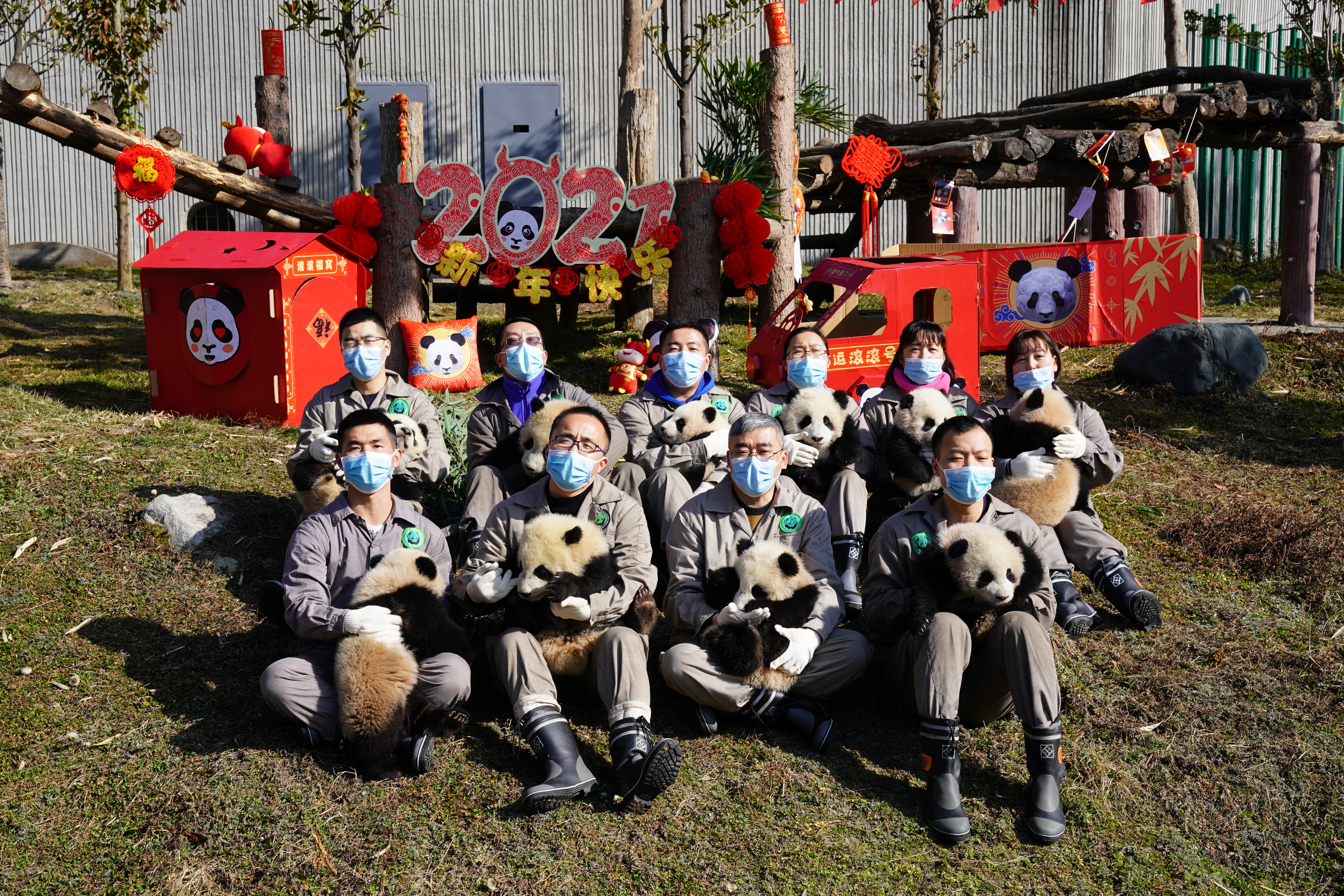 (大文新聞網記者 向芸)今日是立春,中國大熊貓保護研究中心的10隻2020級熊貓寶寶亮相卧龍神樹坪基地,向大家送上新春祝福。當奶爸奶媽們抱着10隻熊貓寶寶走進幼兒園運動場時,大家的心都被萌化了。