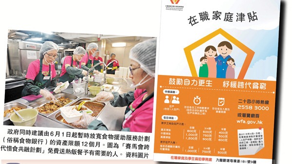 (香港文匯報記者 聶曉輝)新冠肺炎疫情令各行各業與基層市民同受重創,為進一步支援有經濟困難的人和家庭,勞工及福利局局長羅致光昨日宣布,擬放寬在職家庭津貼計劃(職津)的申請門檻,合資格的非單親住戶基本工時由每月最低144小時減半至72小時,為期一年,預計惠及2.4萬個新增住戶。政府同時建議由6月1日起暫時放寬食物援助服務計劃(俗稱食物銀行)的資產限額12個月,料額外協助12萬人次。這兩項計劃合共涉款13.84億元額外開支,最快6月落實安排。